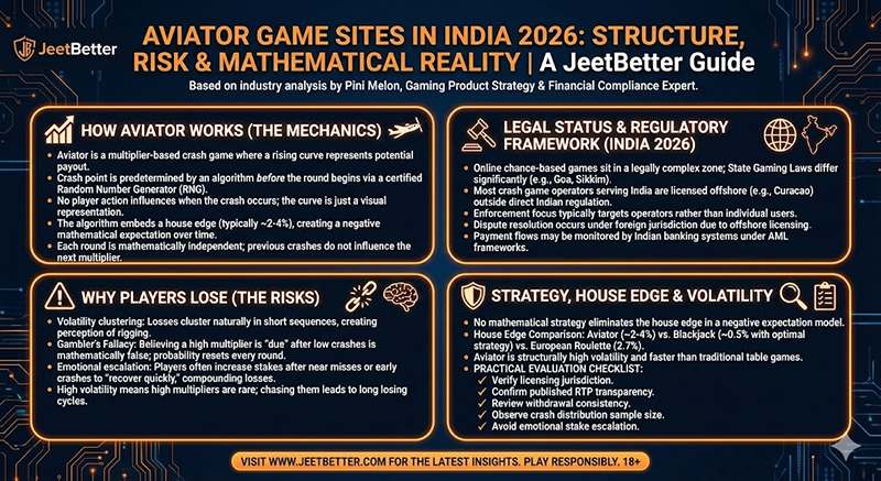Aviator casino sites in India operate as crash-style betting platforms where outcomes are generated by a Random Number Generator and shaped by a built-in house edge. The game is fast, volatile and mathematically negative expectation over time. Under current Indian regulatory interpretation, legality varies by state and most operators function under offshore licensing frameworks.