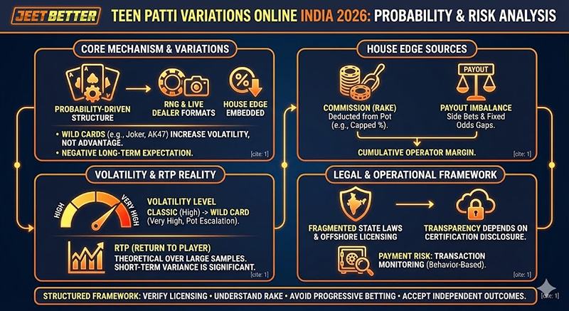 Teen Patti variations explained with RTP, house edge, volatility, legality, and fairness insights for India 2026. Evidence based risk analysis.