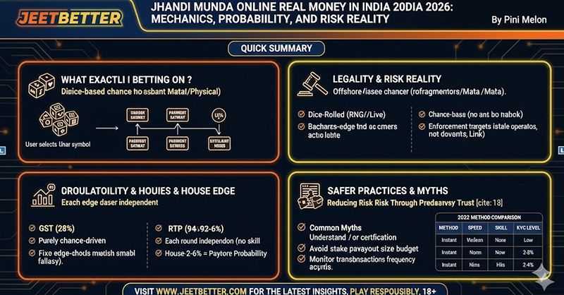 Jhandi Munda online real money explained with RTP, house edge, volatility, legality, and fairness insights for India 2026. Analytical review by Pini Melon.