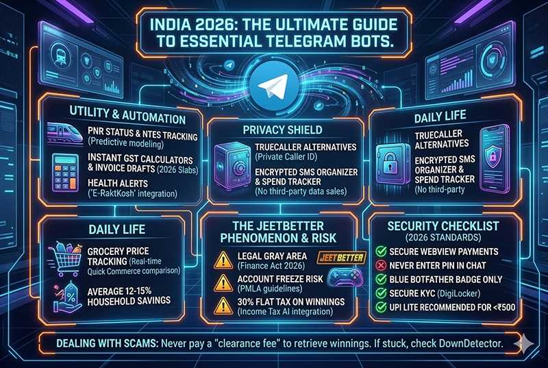 In 2026, Telegram has evolved from a simple messaging app into a critical infrastructure layer for millions of Indians. This guide explores the sophisticated world of Indian Telegram bots, from IRCTC PNR trackers and GST calculators to the high-risk “JeetBetter” gaming bots. Whether you are looking to automate your daily grocery hunt or trying to understand the legality of bot-based earnings under the latest RBI guidelines, this article provides an analytical, hands-on roadmap to using Telegram safely and efficiently in the current Indian digital climate.