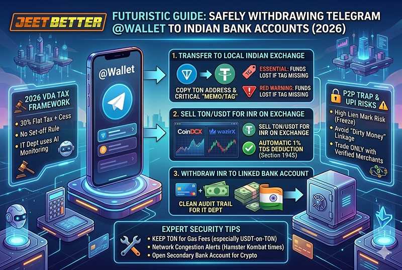 Learn how to safely withdraw from Telegram Wallet to an Indian bank account. Expert advice on VDA taxes, TDS, P2P risks, and avoiding UPI blocks in 2026.